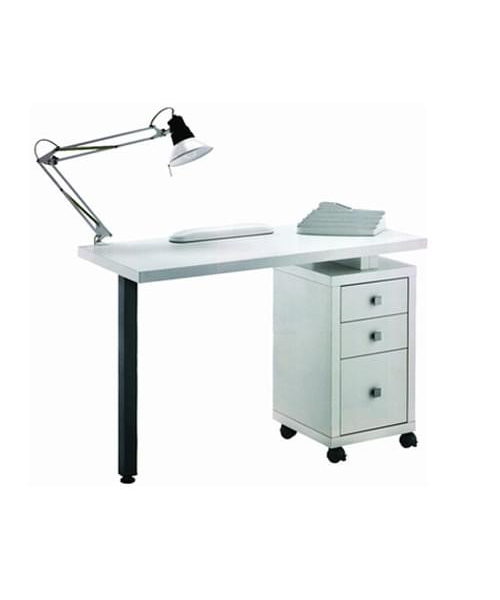 Маникюрный стол с вытяжкой, одной тумбой и ламинированной столешницей белого цвета или цвета венге. Тумба выполнена из ДСП, оснащена четырьмя выдвижными ящиками и колесами. В комплекте: лампа, подушка для маникюра, подставка для лаков. Размер: 115х50x79